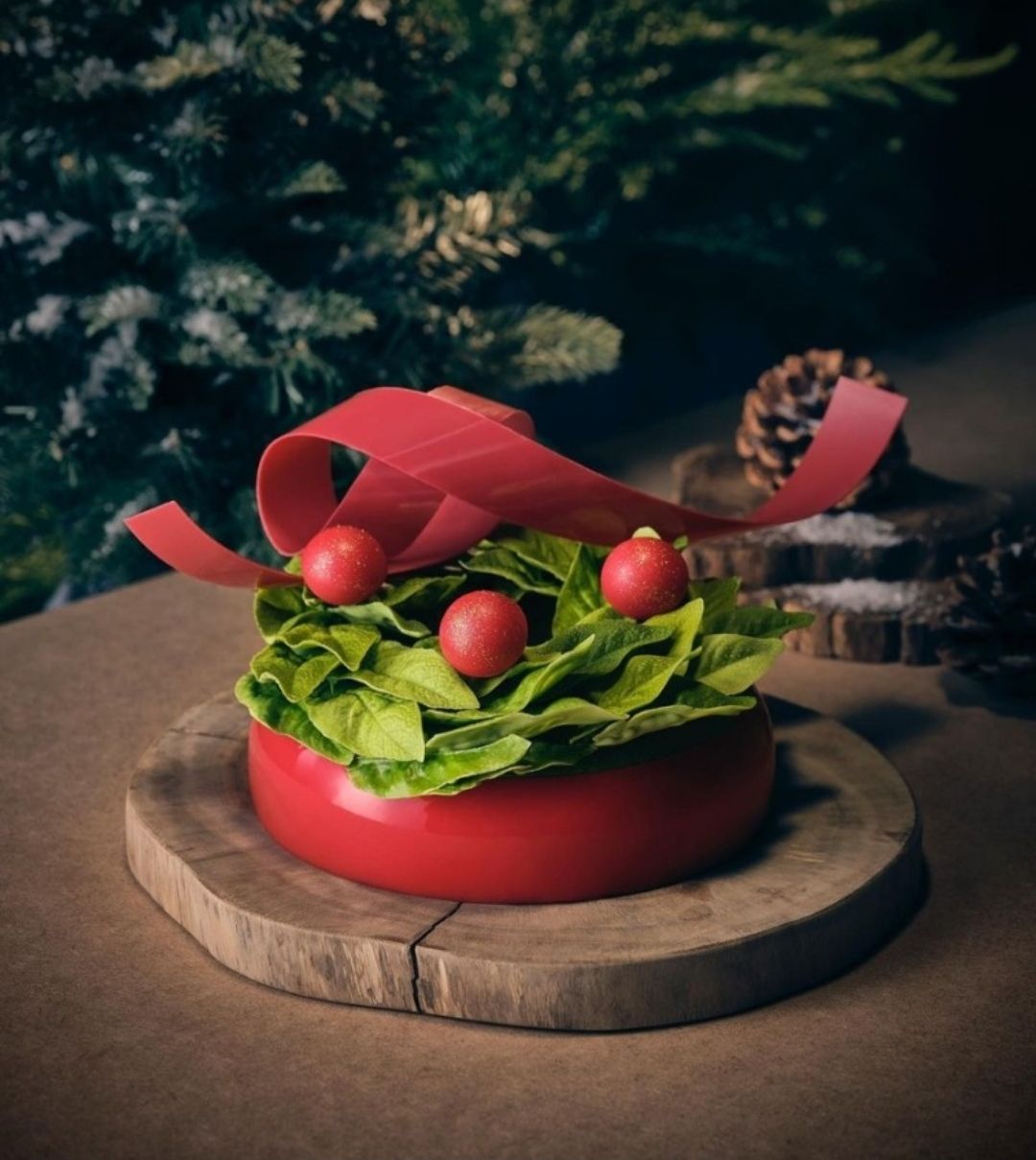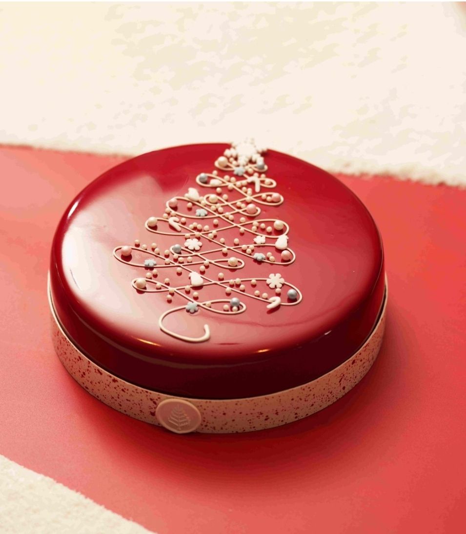 레드 크리스마스 케이크는 계피, 정향 등 다양한 향신료가 어우러진 부드러운 크림, 달콤한 초콜릿 무스, 상큼한 체리 콤포트, 얇고 바삭한 비스킷으로 구성되어 있습니다.