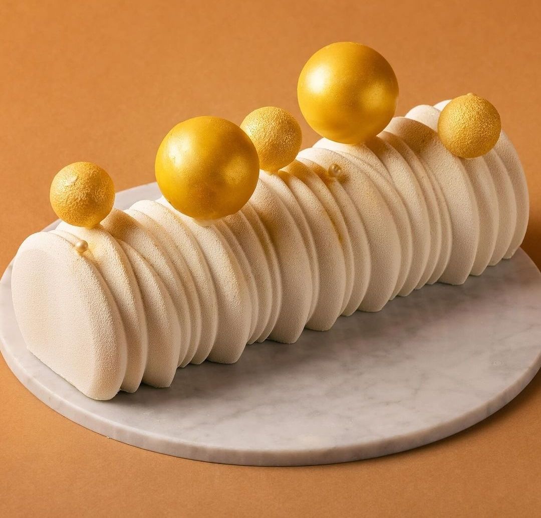 부쉬 드 노엘을 모던하게 해석한 버전으로 헤이즐넛과 바닐라 디플로마 크림, 카라멜, 다크초콜릿 크런치로 구성된 케이크입니다.