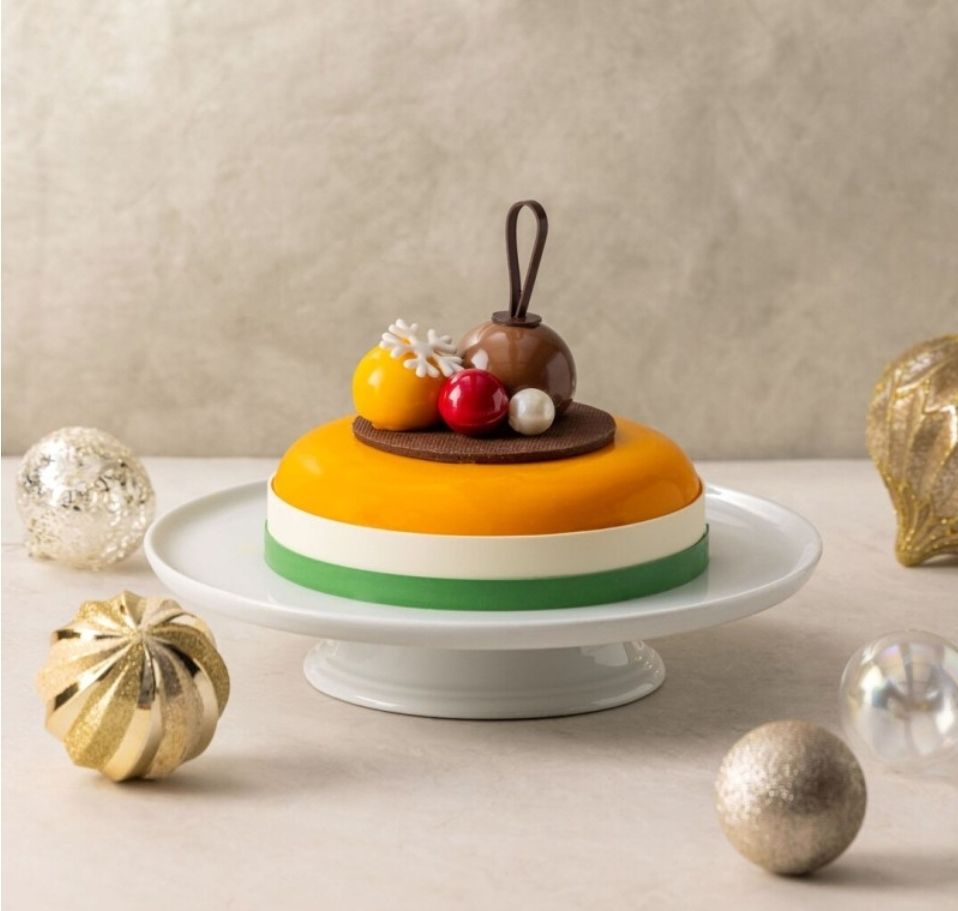 크리스마스 트리의 오너먼트 같은 모양으로 노란색 오렌지 키르슈로 둘러져 있어 맛을 상상하는 재미와 반전 매력의 케이크라고 합니다.