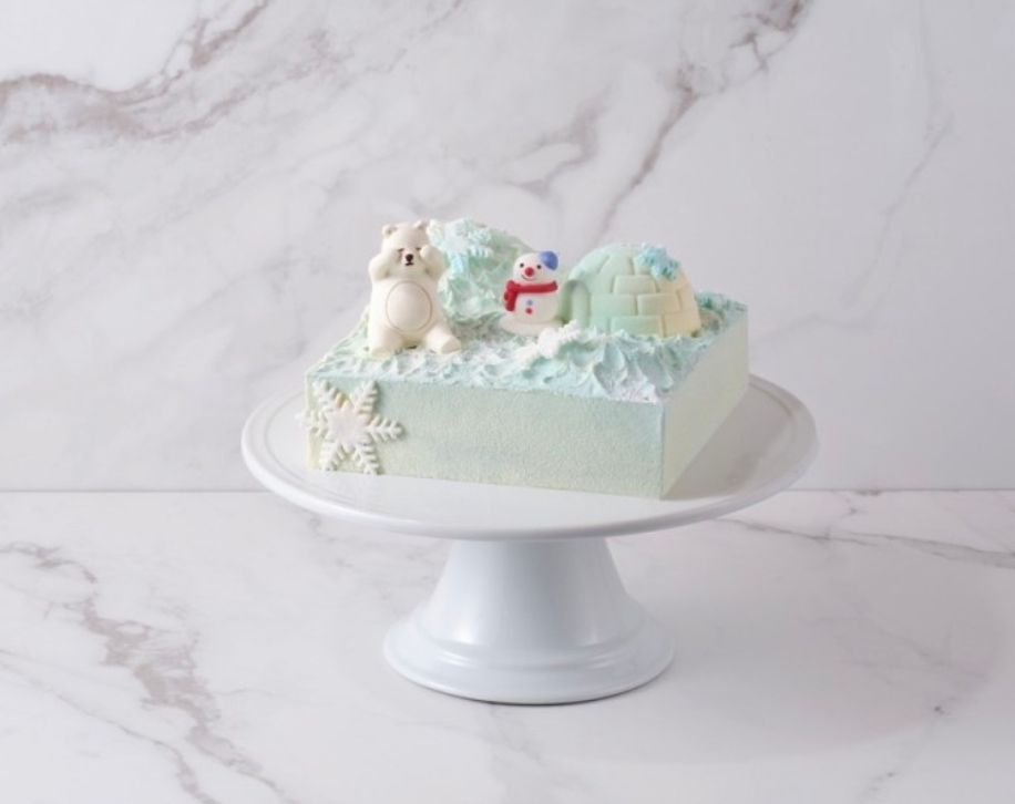 이글루와 설산, 북극곰을 표현한 케이크로 일반적인 티라미수와 차별화된 스카이 블루 컬러가 독특합니다.