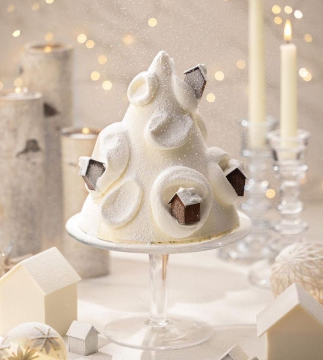 겨울나무로 둘러싸인 설산을 형상화했으며, 부드러운 마스카포네 크림과 라즈베리 콩피로 마무리한 스펀지케이크입니다.