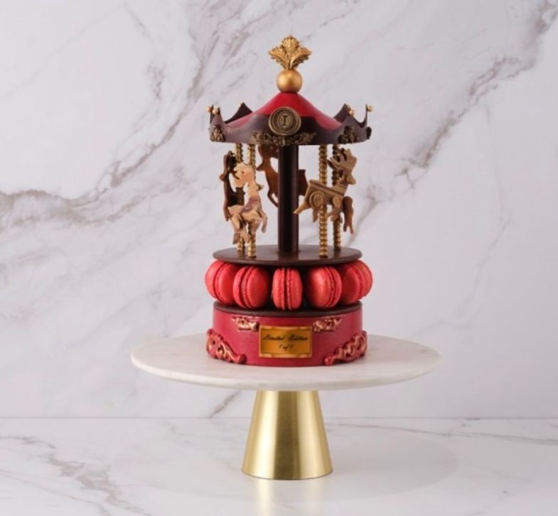 메리고라운드 케이크는 회전목마를 모티브로 했으며 발로나 초콜릿으로 만든 사슴 장식과 레드 마카롱 아래에는 다양한 초콜릿 봉봉이 담겨 있습니다.