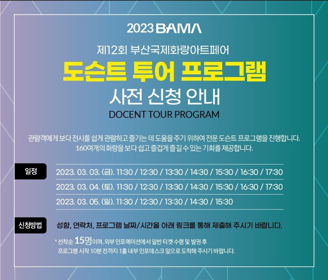 도슨트 투어와 같이 선착순 15명이며, 외부 인포메이션에서 일반 티켓 수령 및 발권 후 프로그램 시작 10분전까지 1홀 내부 인포데스크 앞으로 도착하시면 됩니다.