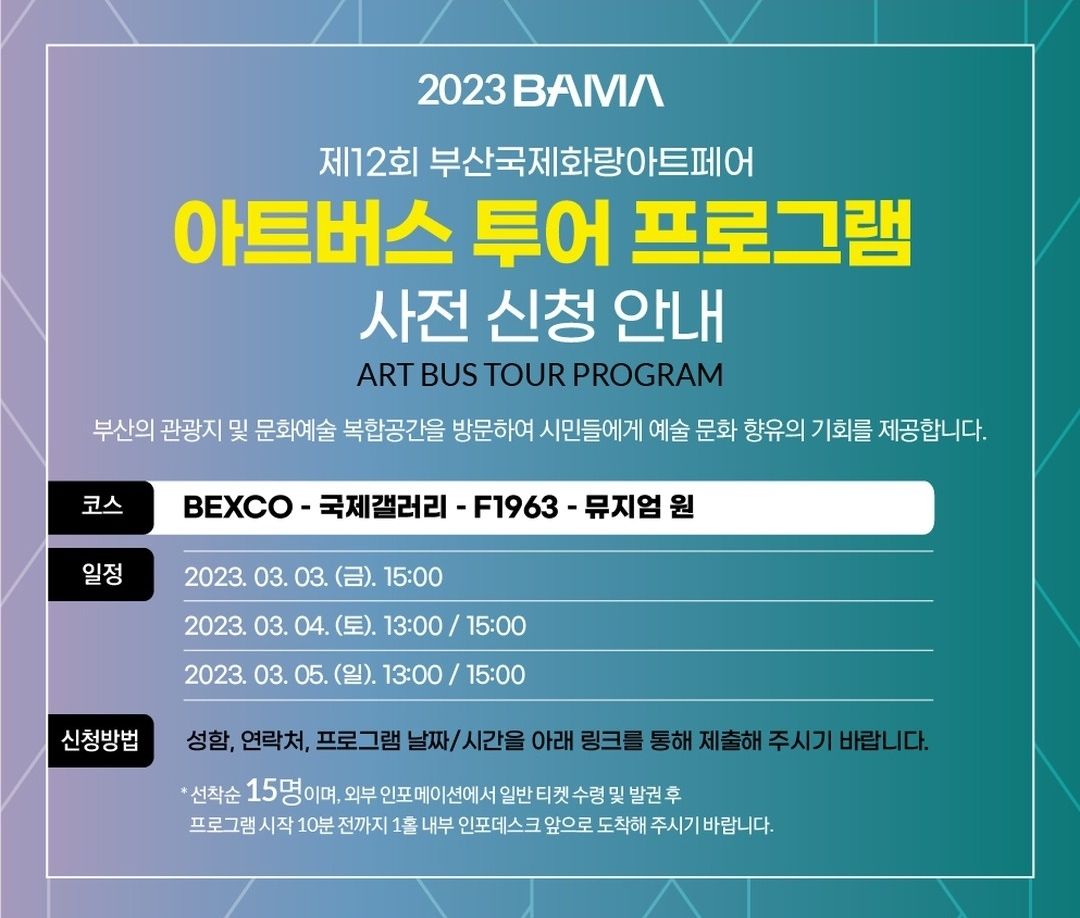 부산 관광지와 문화예술공간을 소개하는 아트버스 투어는 BAMA 도슨트 관람 후 국제갤러리, F1963, 뮤지엄원을 둘러보는 코스로 3일 오후 3시, 4일 5일 오후 1시와 3시에 각각 진행되며, 참가 방법은 도슨트 투어와 같습니다.