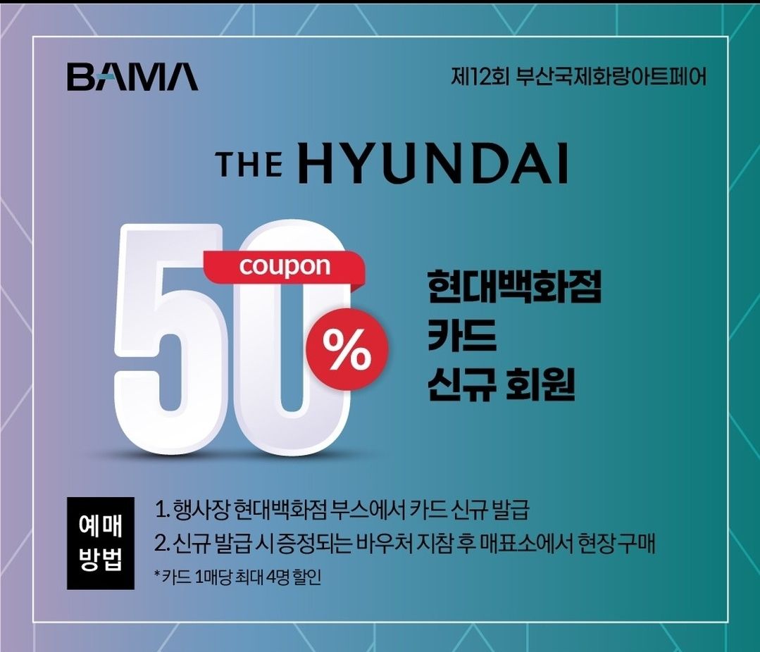 행사장 현대백화점 부스에서 카드를 신규로 발급받으시면 증정되는 바우처 지참 후 매표소에서 현장 구매하시면 50% 할인구매가능합니다.