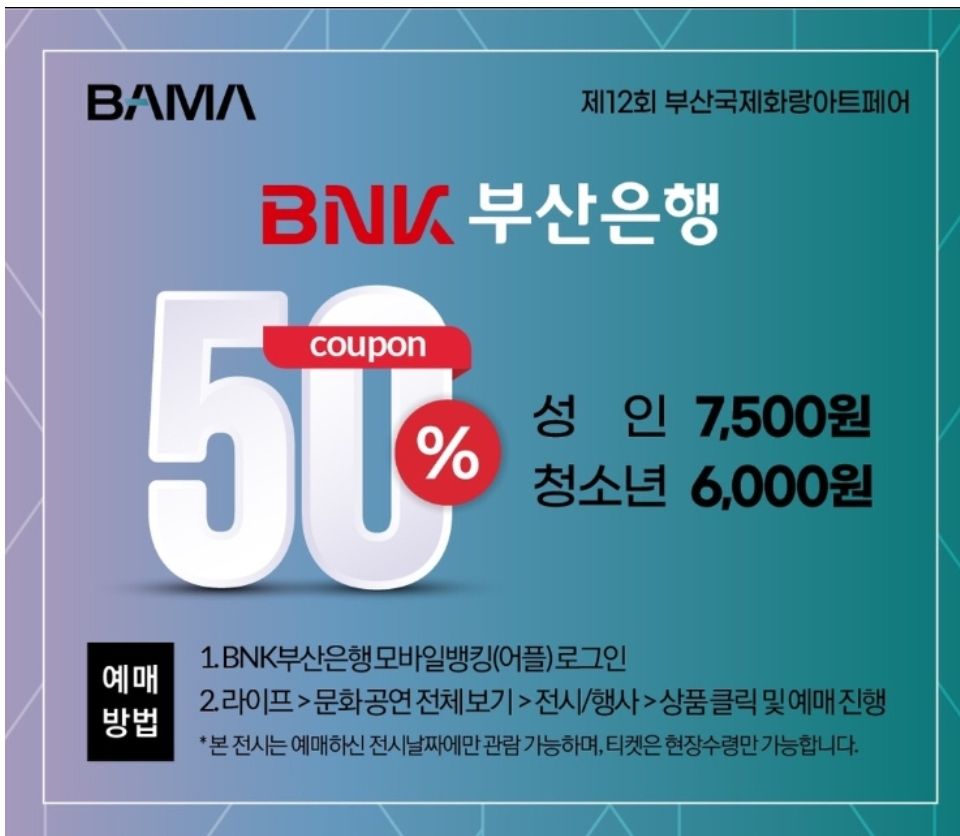 참여방법 : 멤버스 앱 > 2023 BAMA 초대&할인 이벤트 > 할인쿠폰 다운받기 > 현장 매표서 제시 후 50% 할인구매