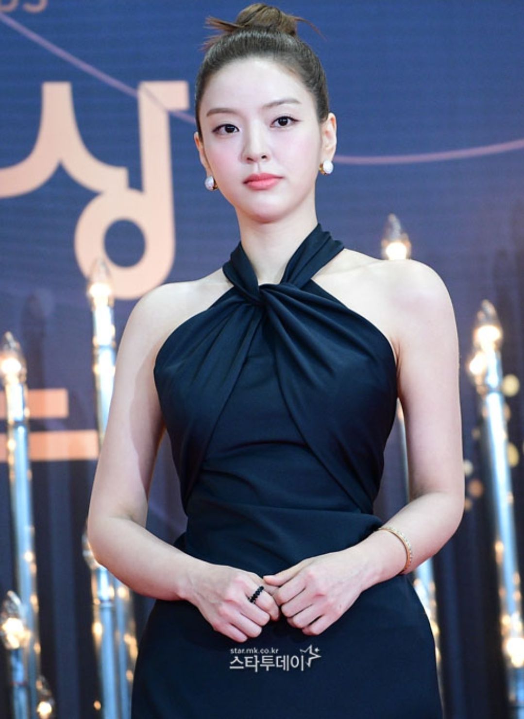 조이현은 반짝이는 펄소재로 된 블랙드레스를 입었는데