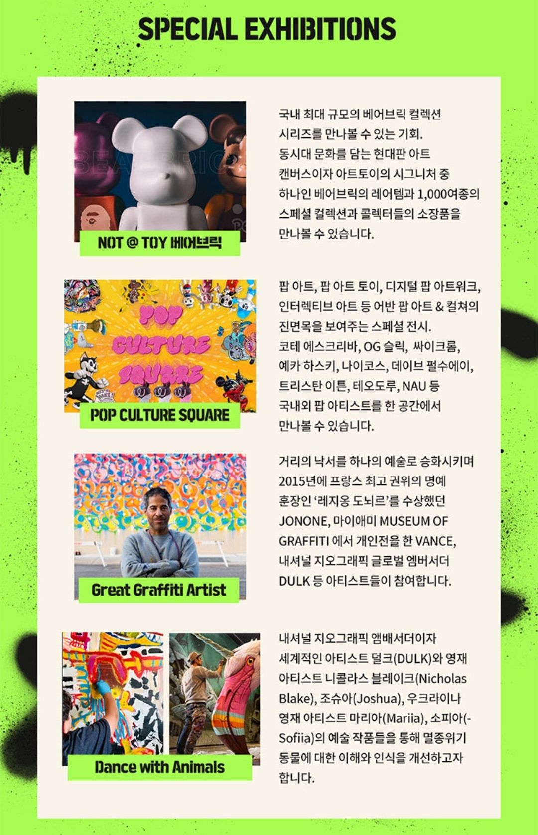 세계적인 작가 DULK 와 2011년생 천재 아티스트 니콜라스 블레이크를 비롯한 영재 아티스트들이 참여하는 멸종위기 동물 특별전이 준비되어 있습니다.