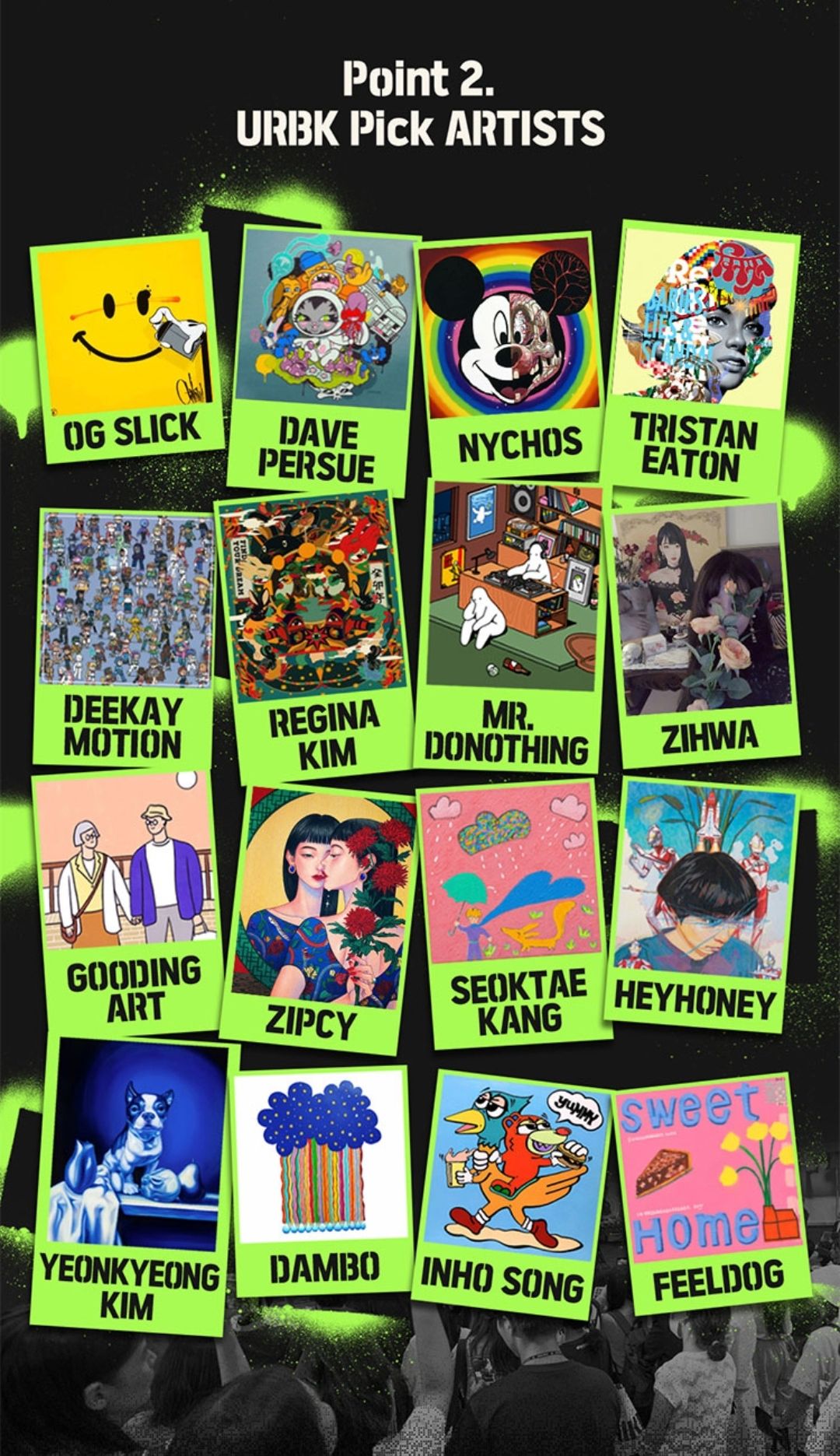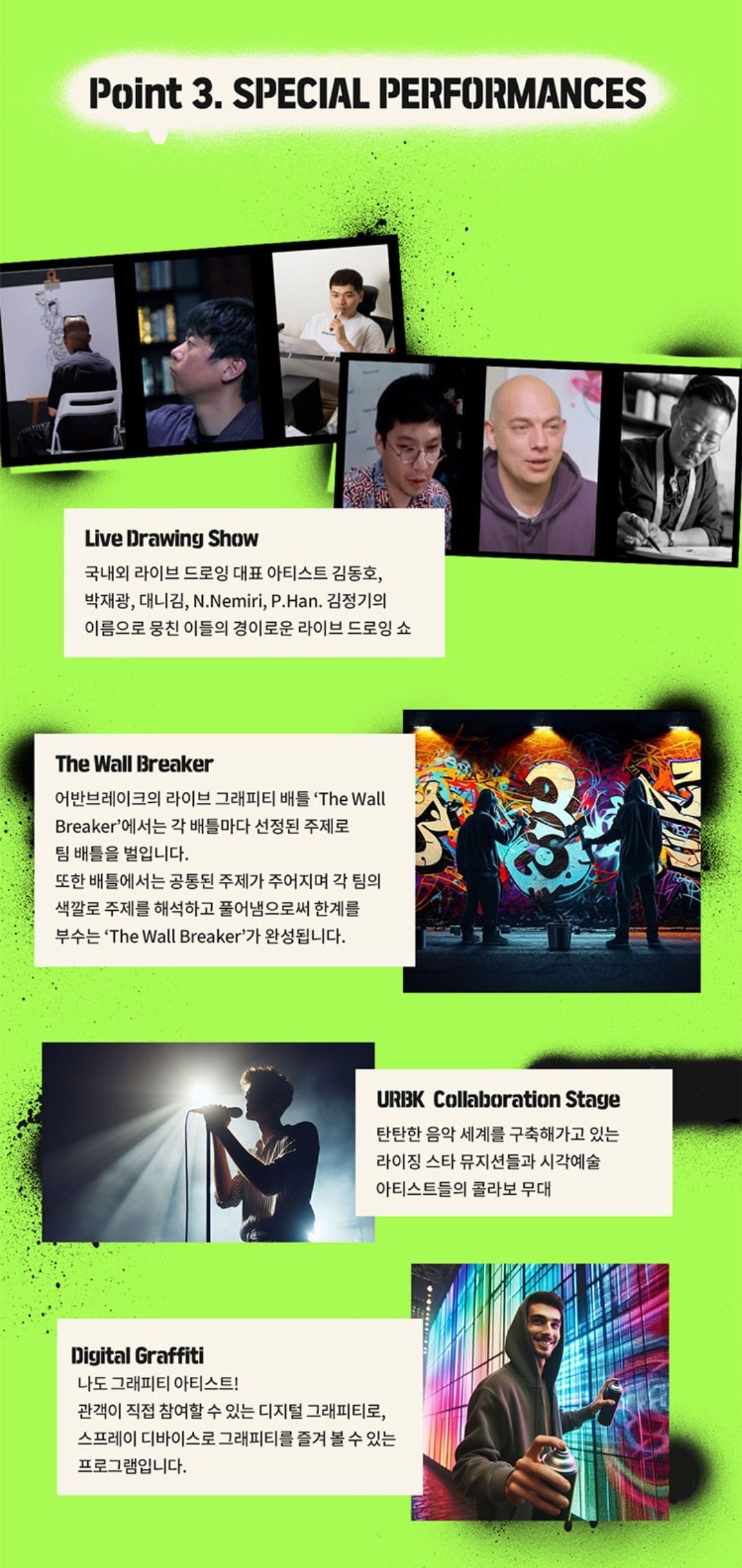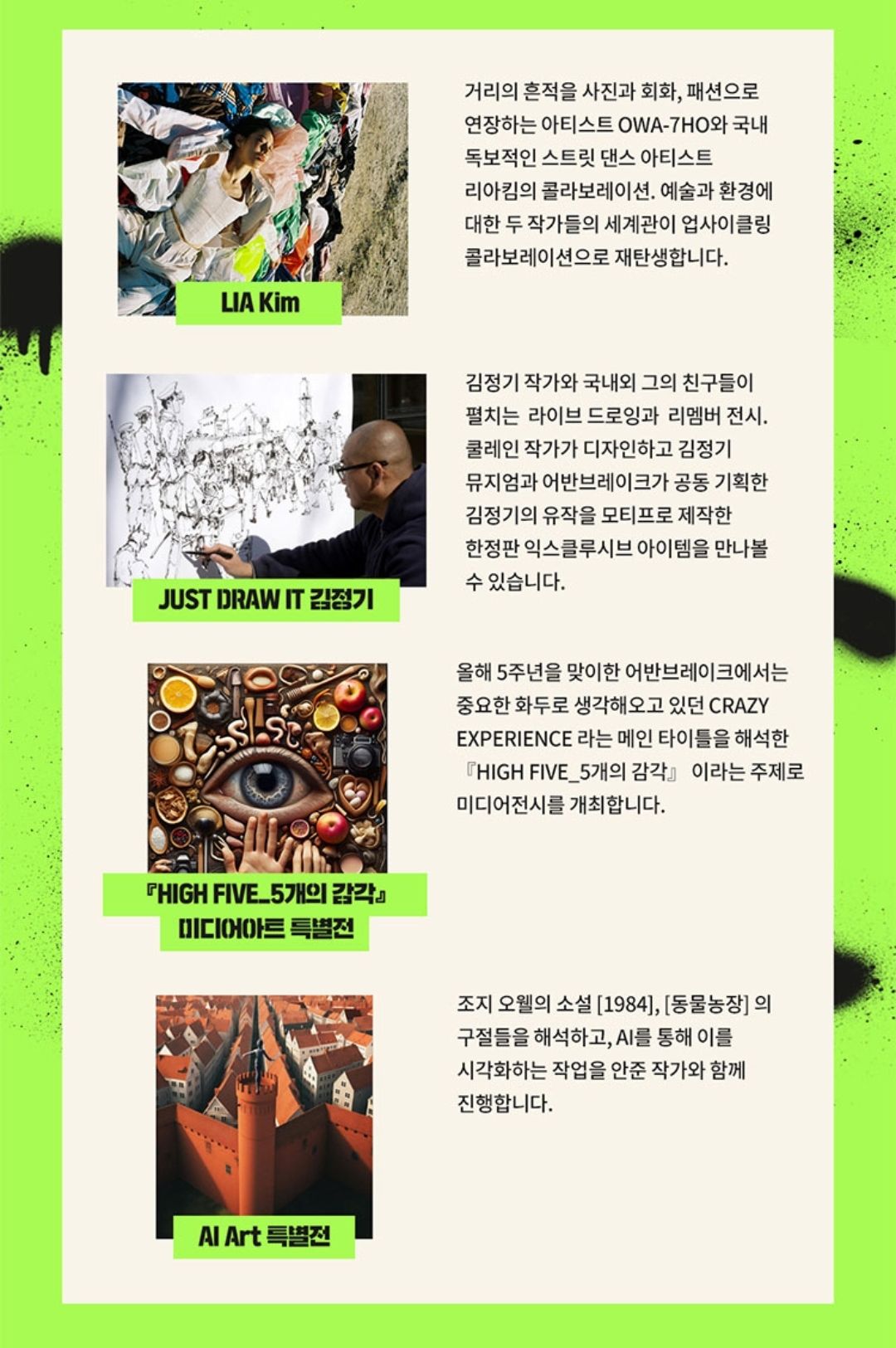 그리고 스트리트아트의 경계를 뛰어넘어 세계적으로 주목받는 VANCE, 2011년생 천재 아티스트 니콜라스 블레이크 등 10여명의 글로벌 아티스트들이 직접 어반브레이크에 참가합니다.