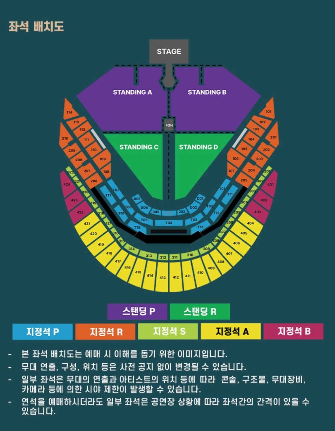 두아 리파 콘서트 좌석은 스탠딩 A, B, C, D 와 지정석 P, R, S, A, B석이 있습니다.