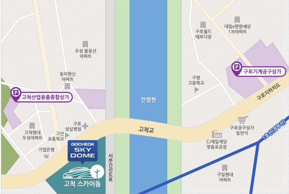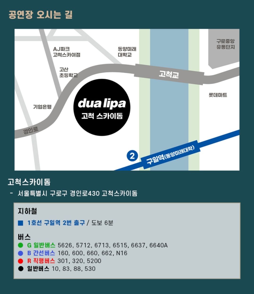 콘서트가 열리는 고척스카이돔은 지하철 1호선 구일역 2번 출구에서 도보로 6분정도 소요됩니다.