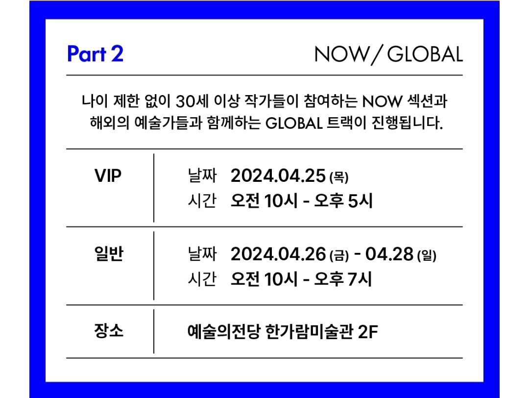 나이 제한없이 30세 이상 작가들이 참여하는 섹션과 해외 예술가들이 참여하는 글로벌 트랙이 진행되는 Part 2 로 진행되며, 기간도 다르니까 참고하시길 바랍니다.