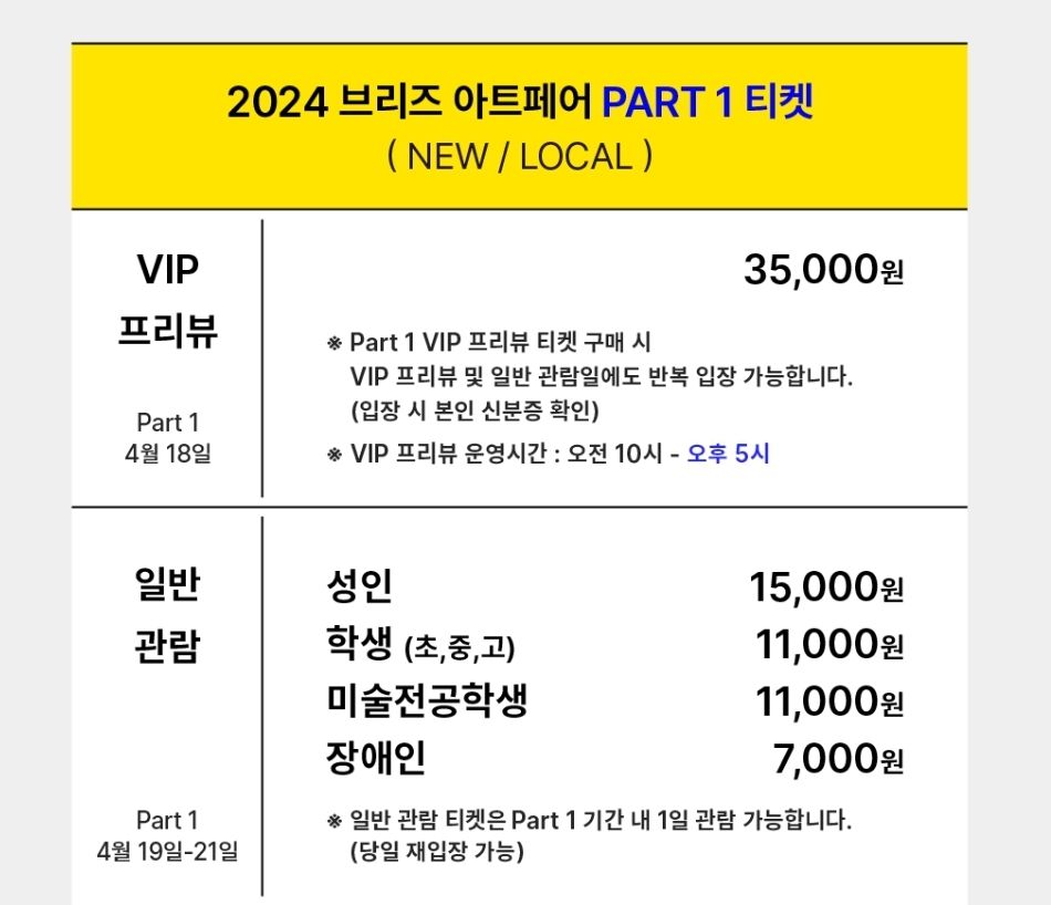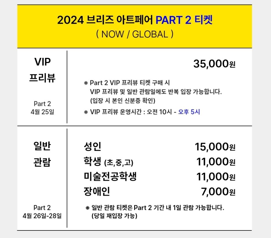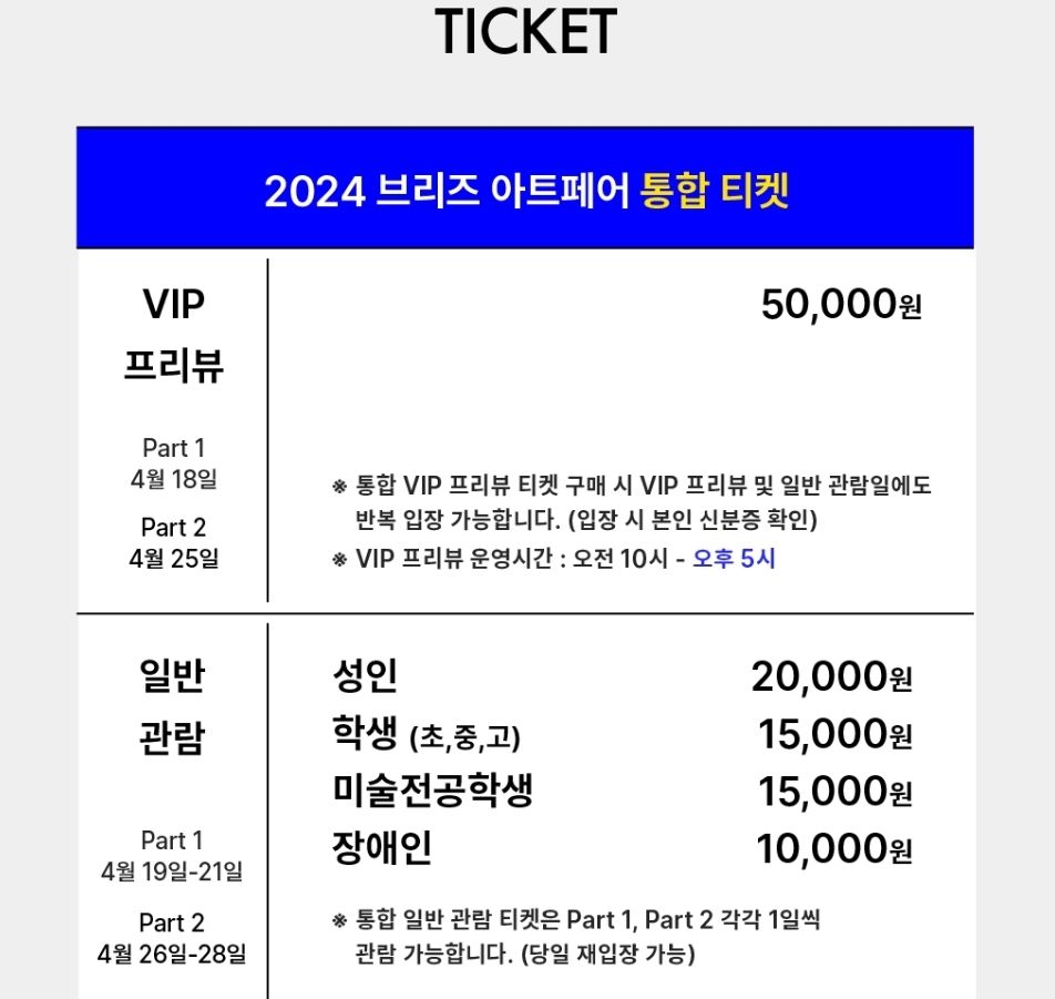 2024 브리즈 아트페어 파트1과 파트2를 다 볼 수 있는 통합티켓 VIP 프리뷰는 50,000원, 통합 일반관람은 20,000원입니다.