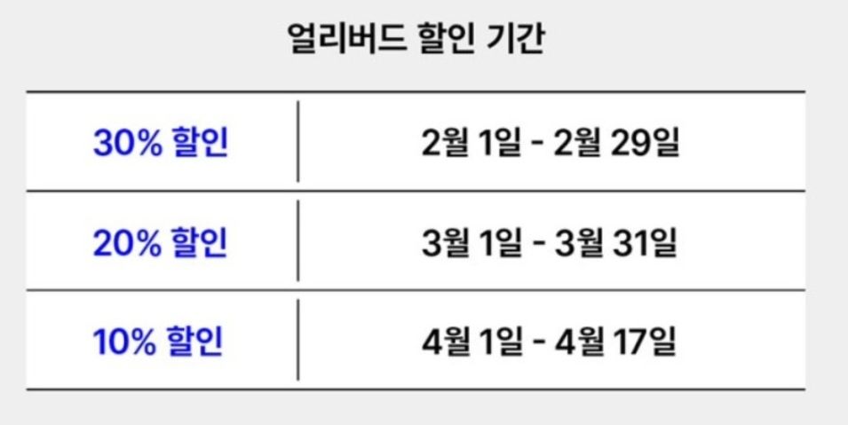 2월 29일까지는 위의 티켓 가격에서 30%할인, 3월 31일까지는 20%할인, 4월 17일까지 구매하면 10%할인이 된다니까