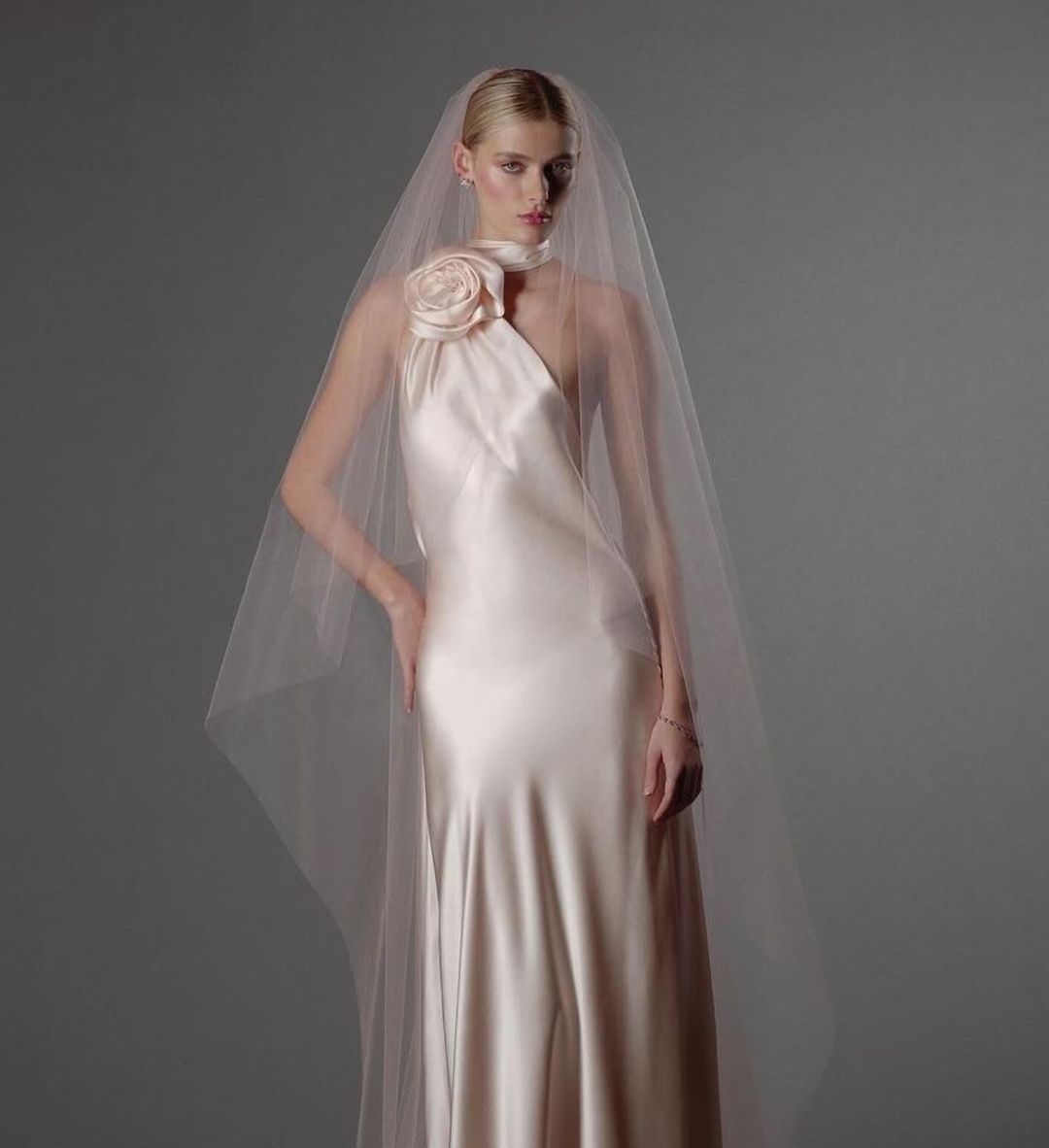 장미모양의 홀터넥이 독특했던 스킨색 새틴실크 드레스.
