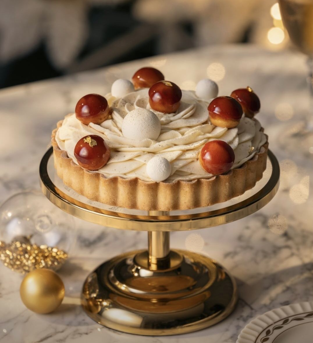 수제로 만든 피칸 프랄린과 카라멜 크림, 풍미 가득한 피칸 무스의 구성으로 이루어진 크리스마스 썰매 케이크입니다.