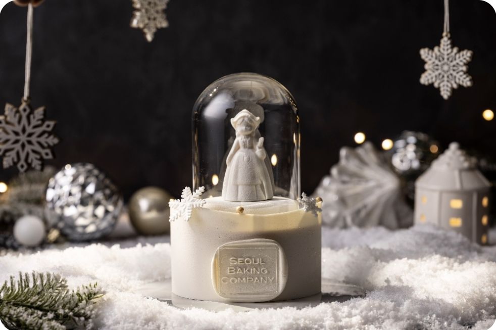 화이트 초코 무스를 베이스로 눈송이를 형상화한 볼 속 딸기 꿀리를 더해 상큼한 풍미와 달콤한 맛이 조화를 이룬 케이크이며, 가격은 정가 7만8천원입니다.