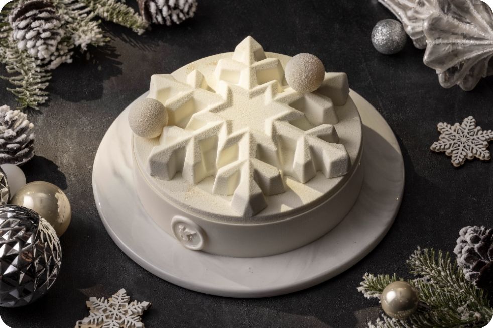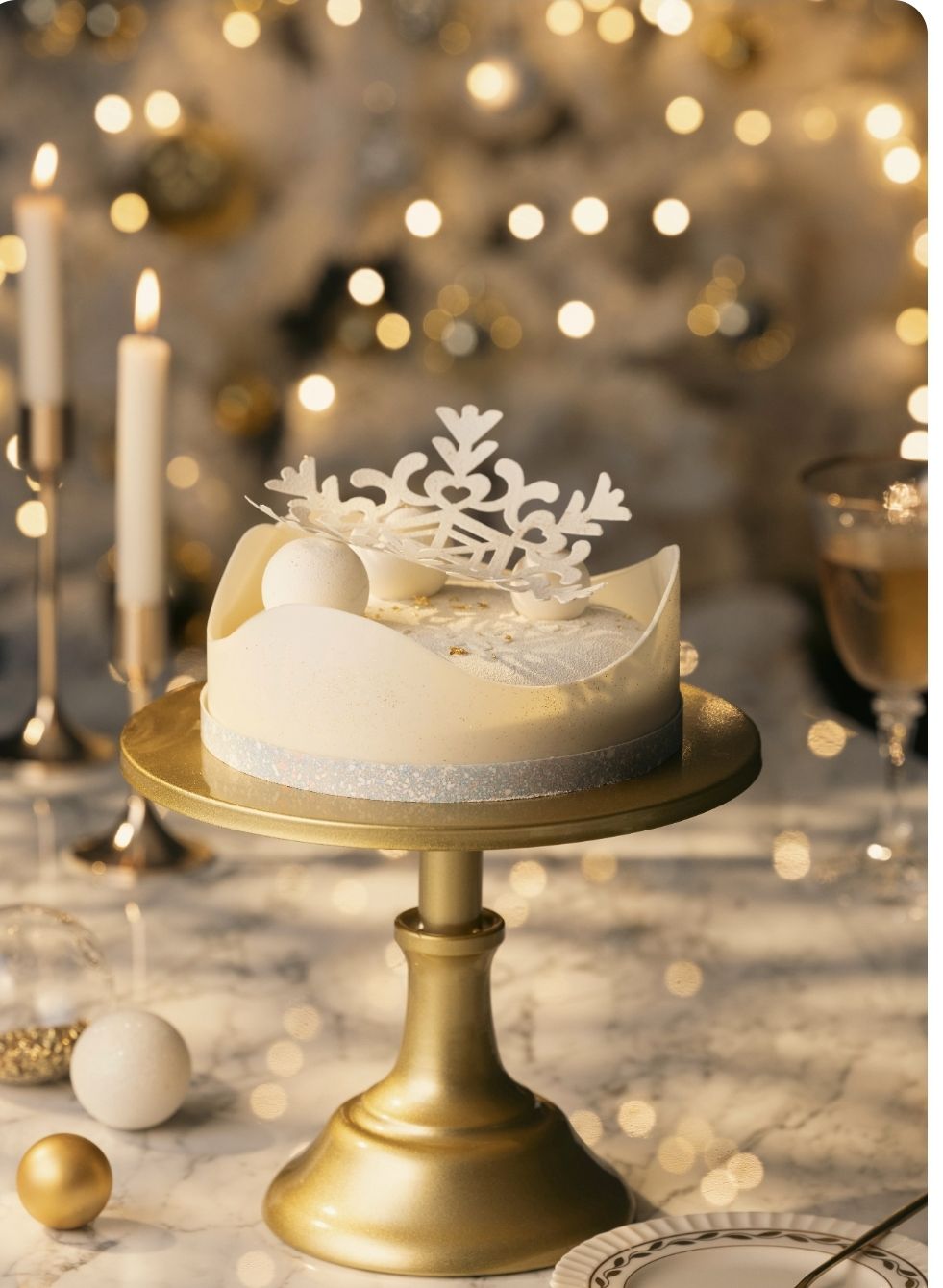 우아하게 빛나는 겨울 밤 하늘의 별을 형상화한 화이트 초콜릿 케이크이며