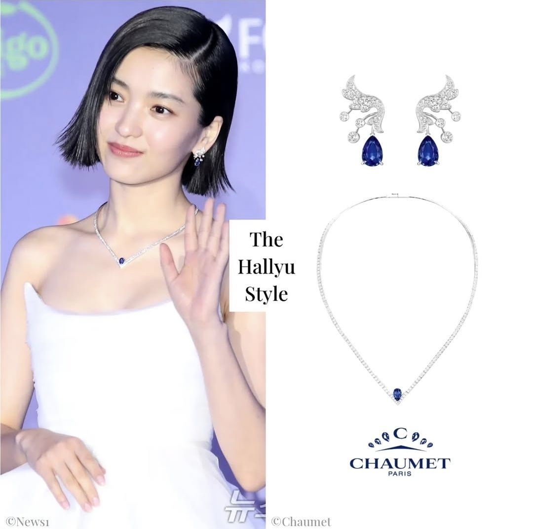 튜브톱으로 어깨를 드러낸 드레스 위로 매치한 네크리스와 이어링도 범상치 않았는데,