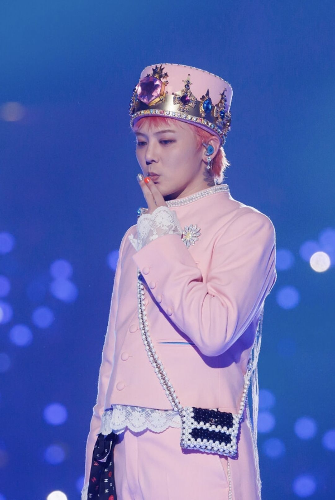 300개 진주를 붙여 커스텀한 핑크 수트에 제이콥앤코의 주얼리와 샤넬 미니 백으로 포인트를 준 지드래곤.