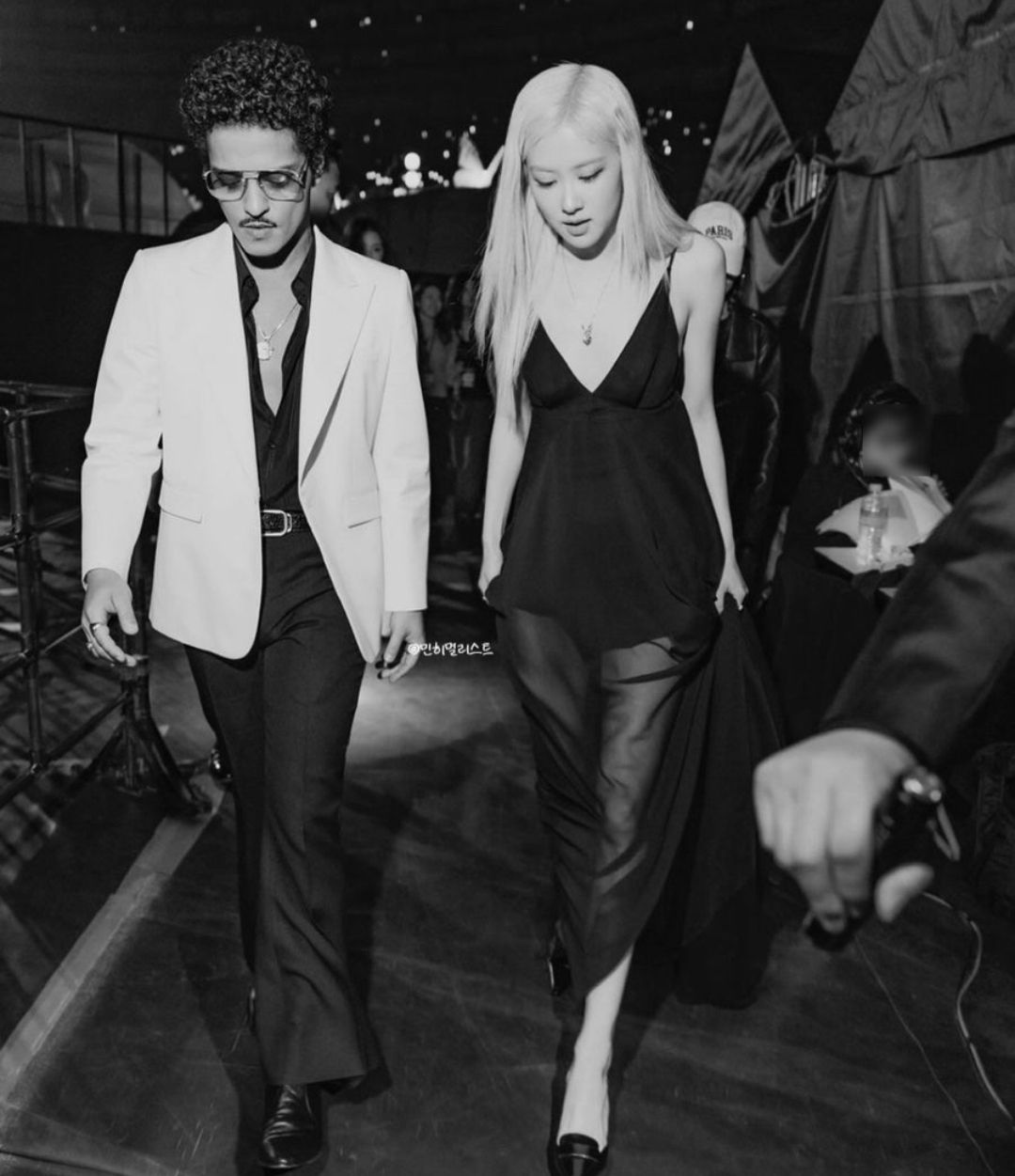 생 로랑 2024 프리폴 컬렉션 아이템인 블랙 맥시 드레스 그리고 화이트 재킷을 활용해 센스있는 시밀러 룩을 선보인 로제와 브루노 마스.