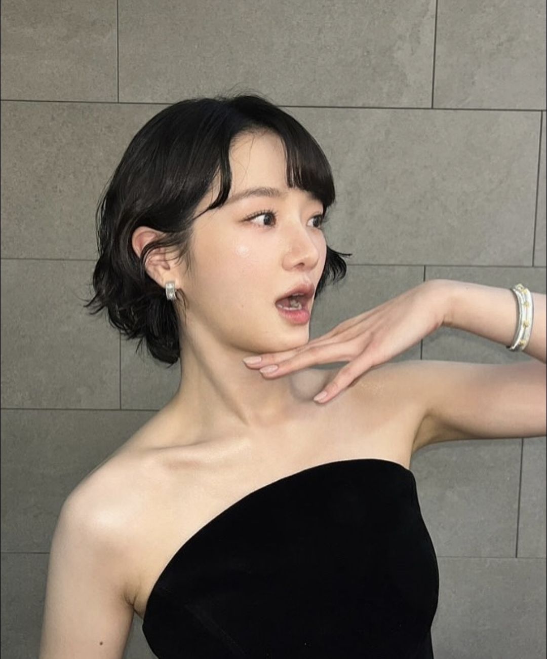 원숄더로 디자인된 블랙 벨벳 드레스를 착용한 안은진.
