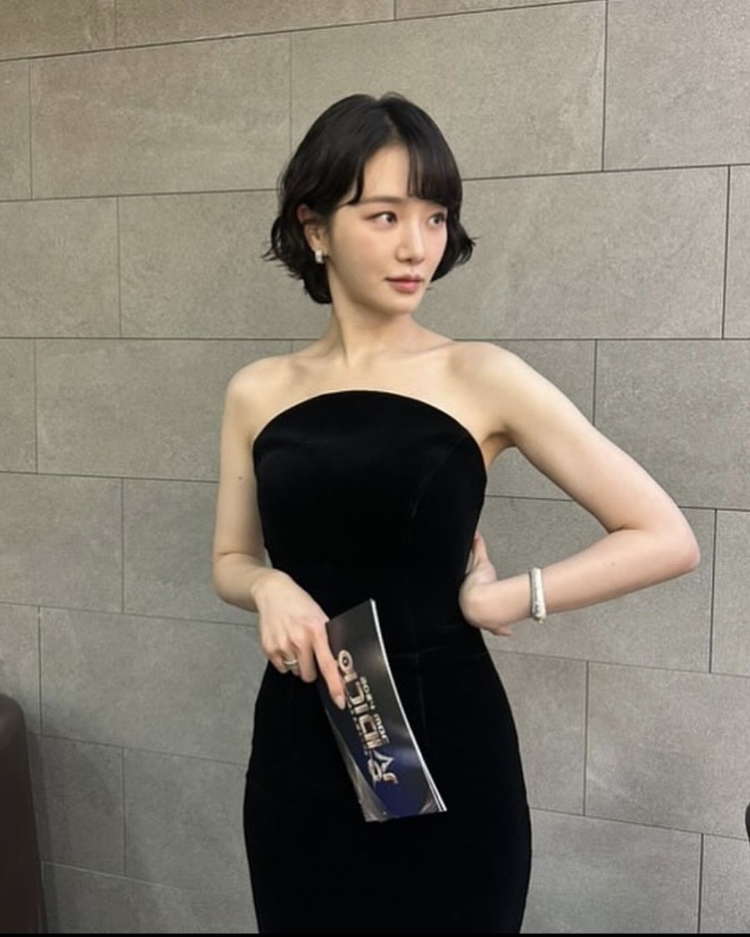 원숄더로 디자인된 블랙 벨벳 드레스를 착용한 안은진.