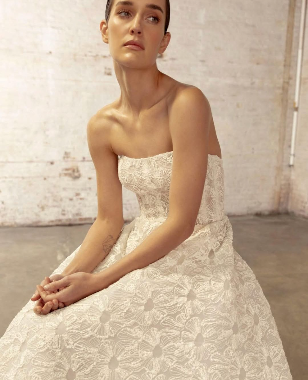 여리여리한 시스루 스타일의 드레스로, 긴소매까지 자수와 비즈가 수놓아져 있고 스커트는 자연스럽게 떨어지는 실루엣이었어요.