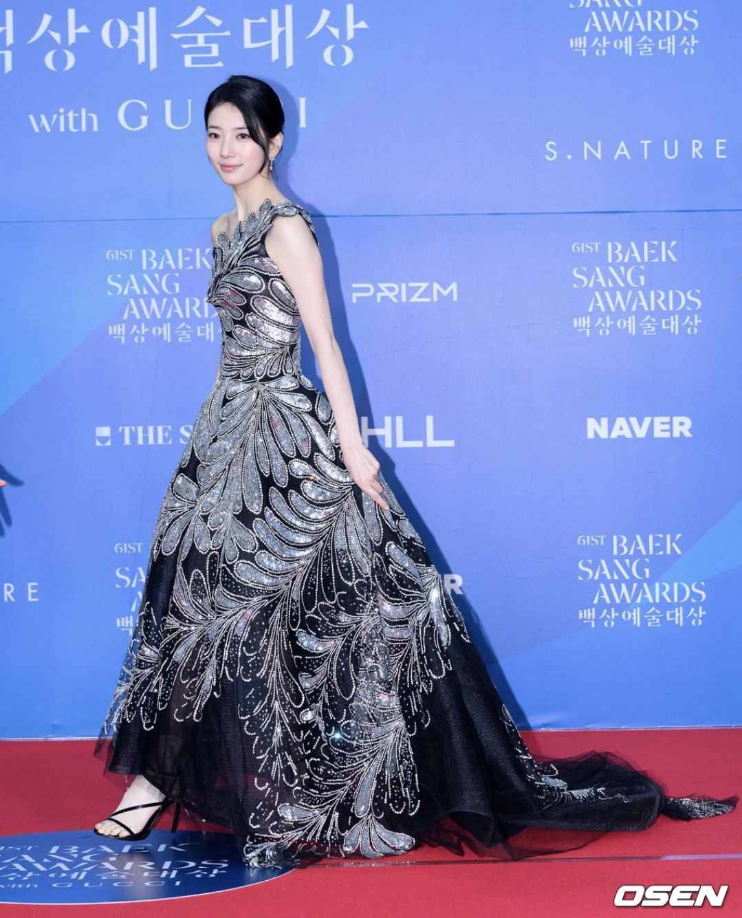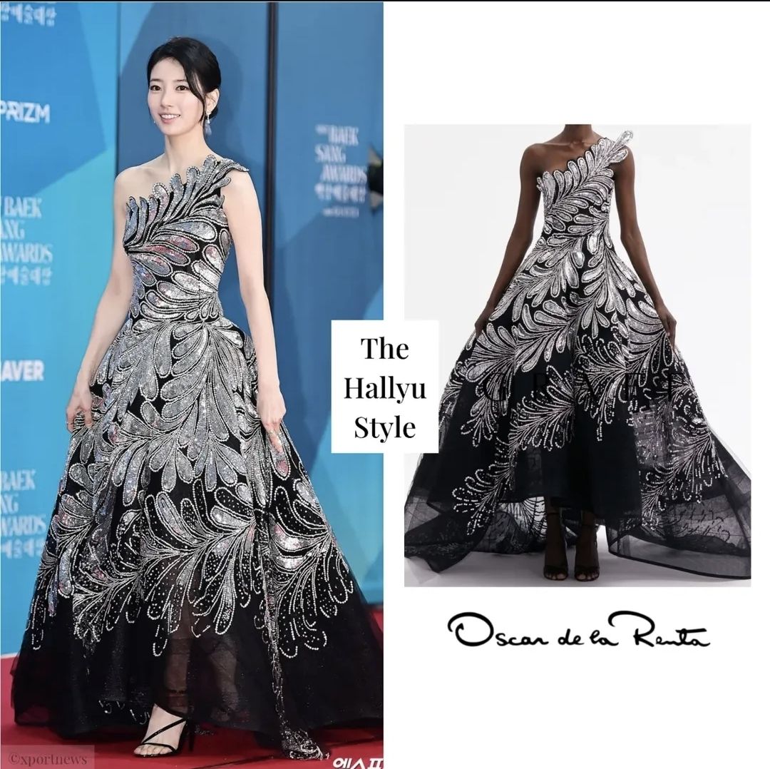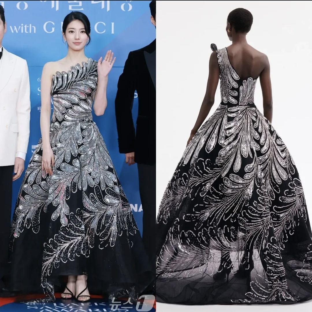 수지는 블랙바탕에 실버빛의 깃털디테일이 화려하게 새겨진 원숄더 드레스를 착용했는데요,