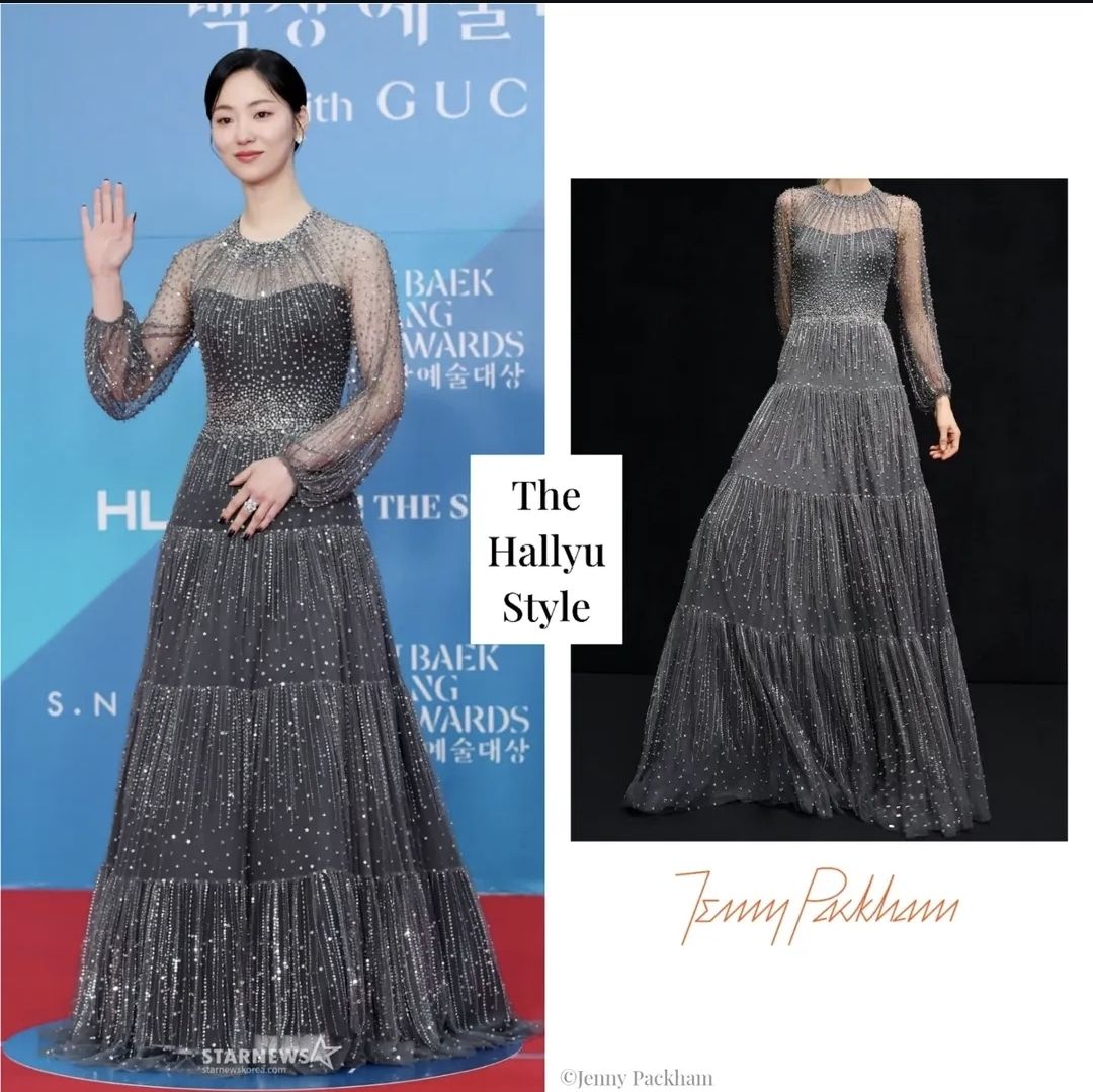 전여빈 배우는 화려한 비즈장식의 제니팩햄 드레스를 착용했습니다.