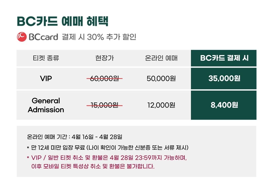 VIP 60,000원-> 예매시 50,000원/ BC카드 결재시 35,000원