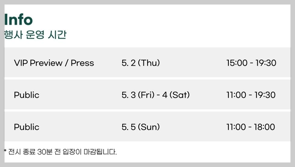 관람시간 ㅣ5/2 15:00~19:30(VIP PREVIEW), 5/3~5/4 11:00~19:30, 5/5 11:00~18:00