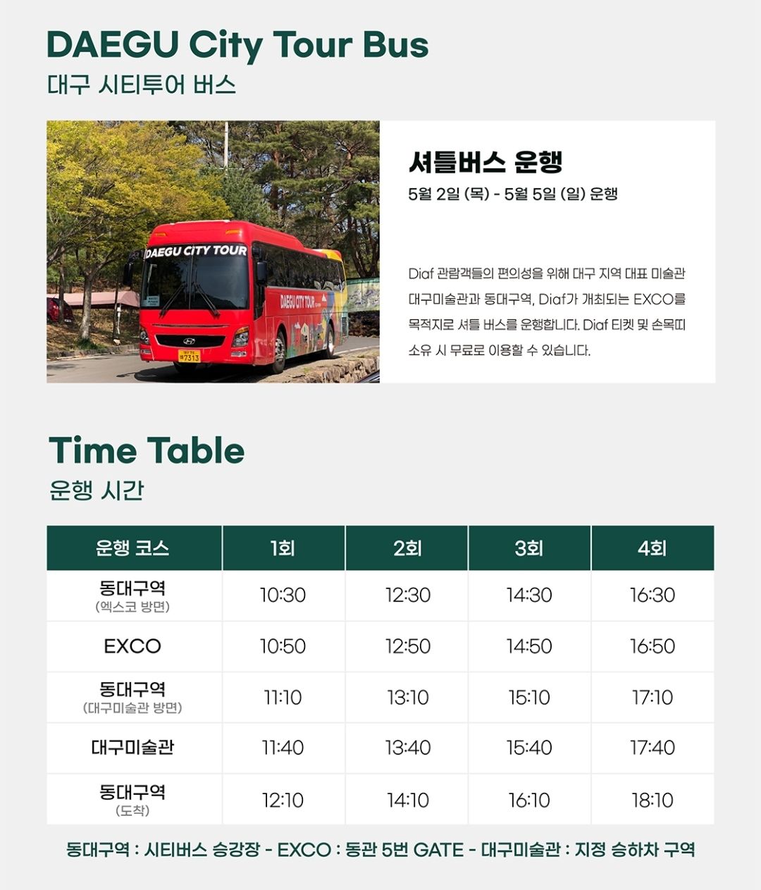 대구 지역 대표 미술관 대구미술관과 동대구역, Diaf가 개최되는 엑스코를 목적지로 셔틀버스를 운행한다고 합니다.