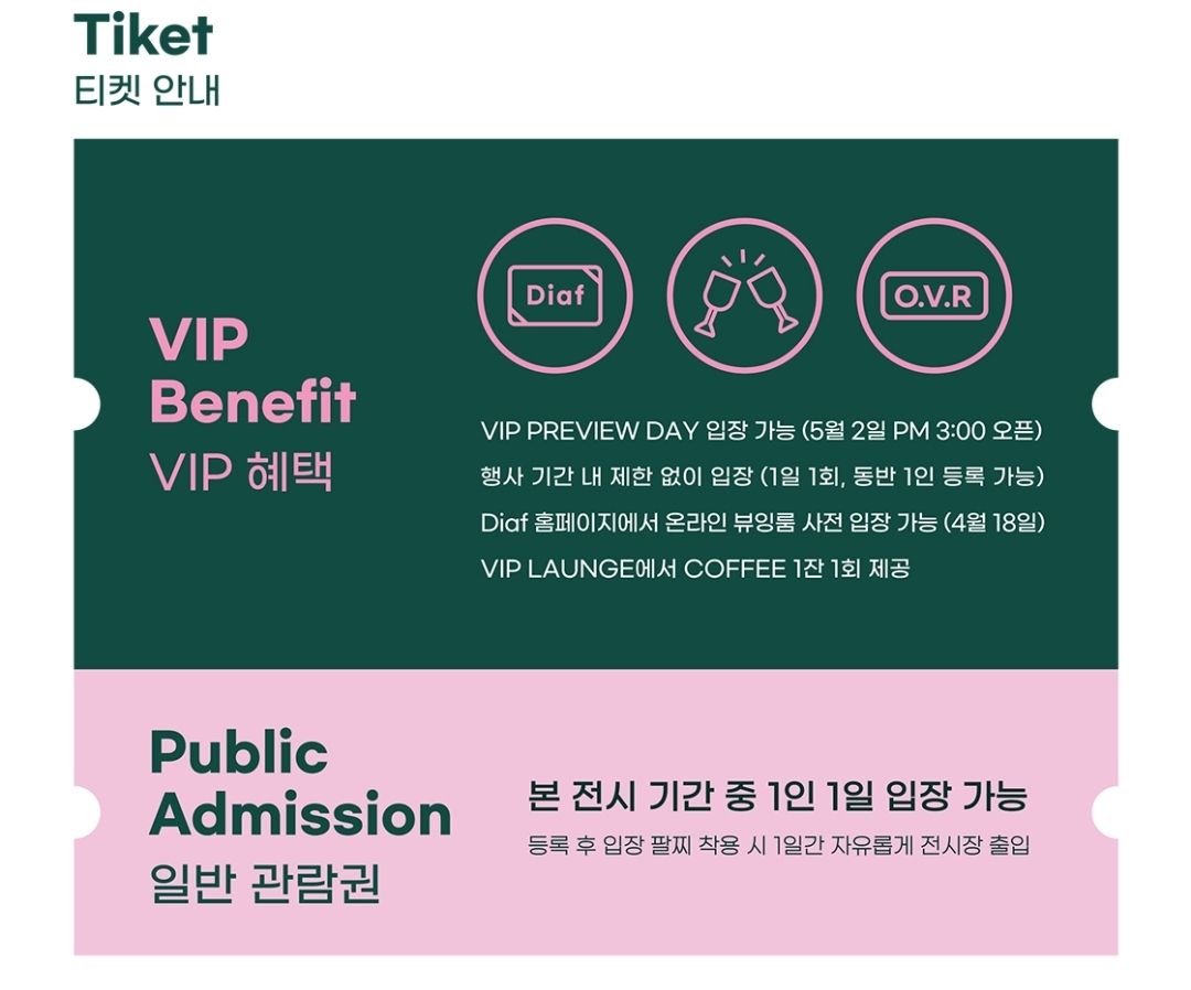 VIP티켓의 혜택은 5월 2일부터 전시기간 내내 재입장이 가능하고(동반 1인 등록 가능)